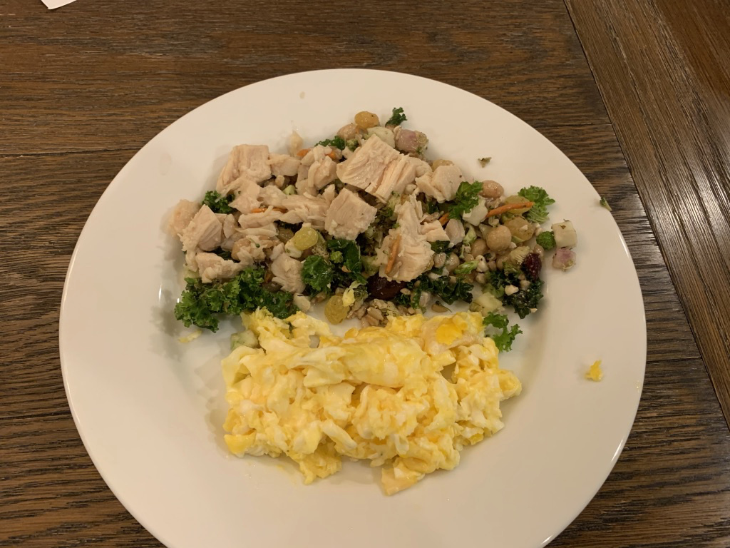 Chicken breast, 2 eggs, salad of kale and chickpeas: