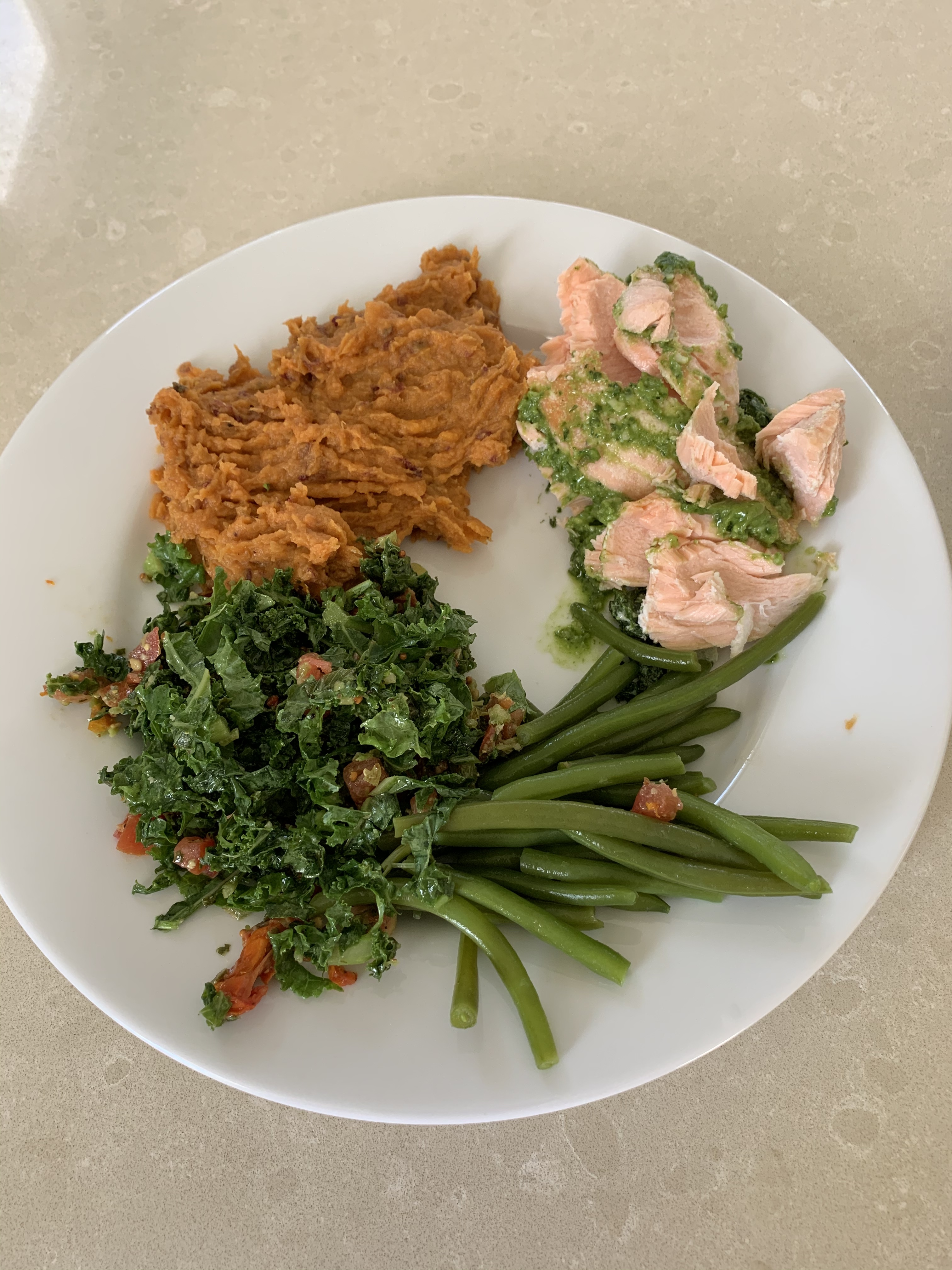 Recovery day lunch: salmon with a little pesto, mashed sweet potatoes, green beans, kale salad. Recovery days are typically heavier on protein and a little lighter in carbs- but because I had a race and strength training yesterday and will have a hard workout plus strength tomorrow, I won’t be lowering carbs much, but will focus on complex, non-refined carbs today.