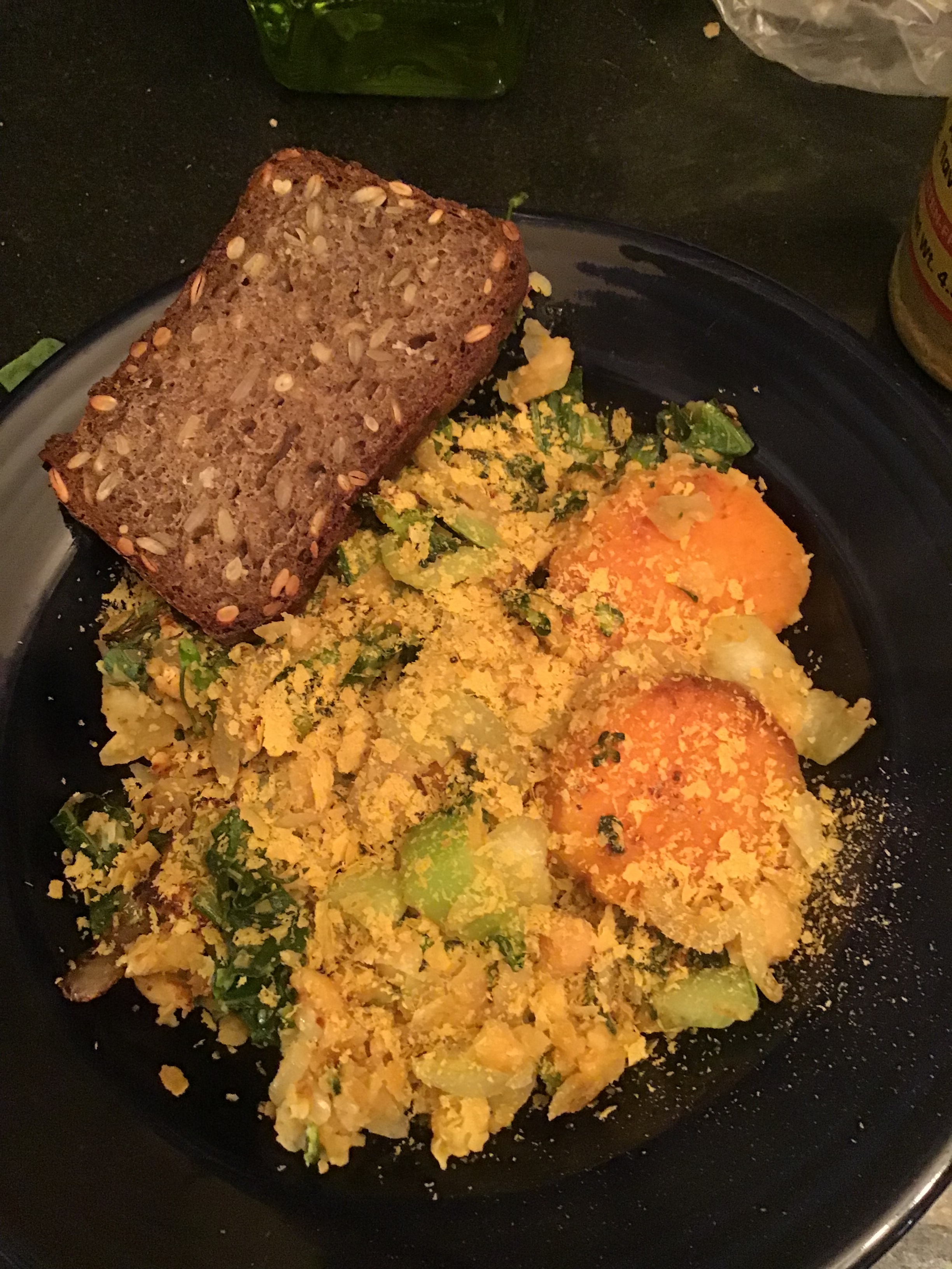 Who said a cup of chickpeas is too much to eat in one sitting? Chickpeas, bok choy, garlic, onions, sweet potatoes and spices. And homemade gf bread. Not made by me.