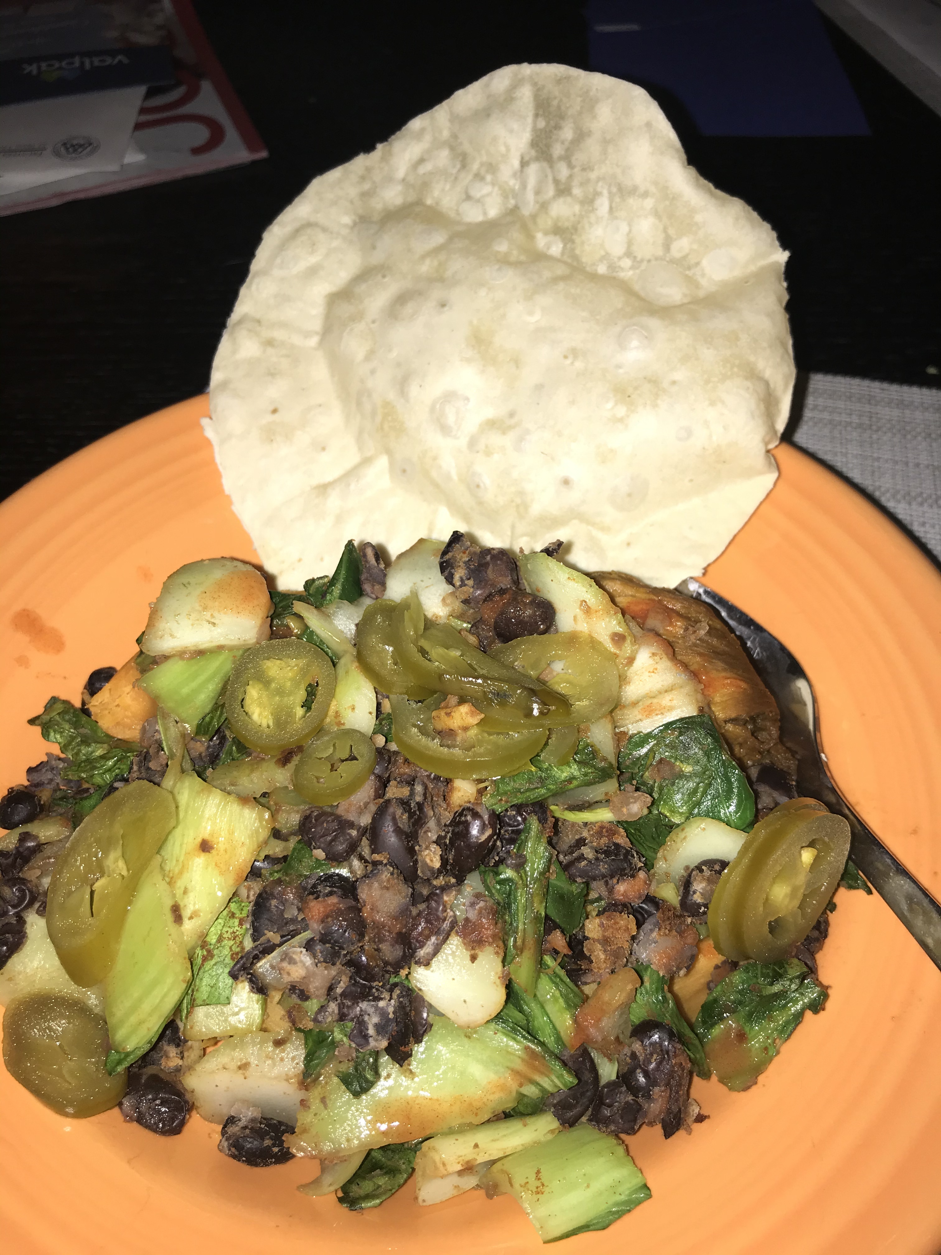 I call these “no-chose “. Because I can’t have the chips. It’s a sweet potato base with black beans, bok choy, garlic, paprika and cayenne. I put jalapeño on it too and a cassava flour tortilla that was toasted.
